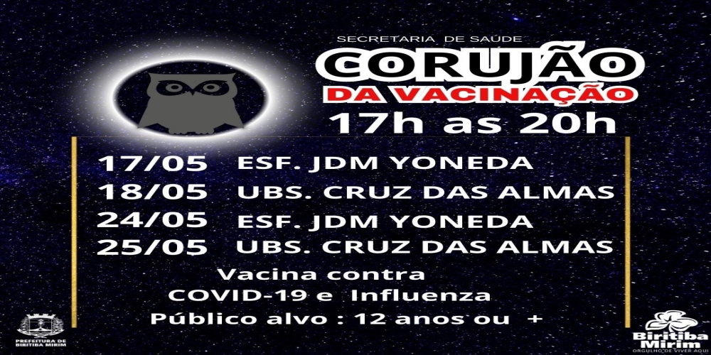 VACINAÇÃO CORUJÃO CONTRA INFLUENZA E COVID-19 ACONTECERÁ NA PRÓXIMA SEMANA