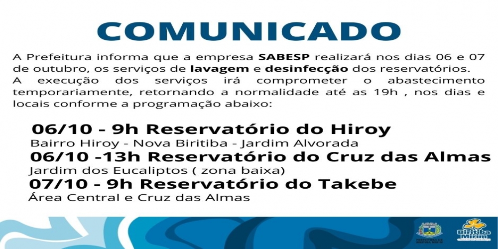 SABESP INFORMA SERVIÇOS NA REDE DIAS 06 E 07 DE OUTUBRO