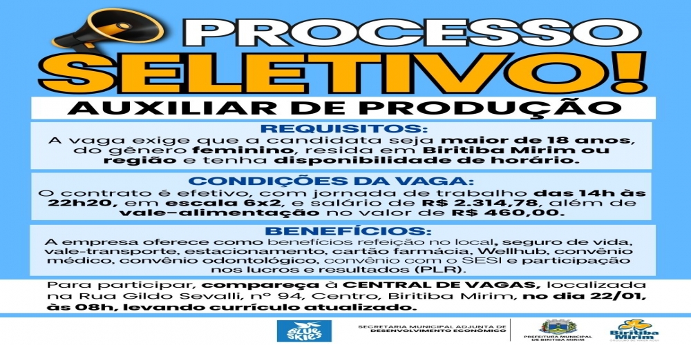 PROCESSO SELETIVO PARA AUXILIAR DE PRODUÇÃO - 100 VAGAS DISPONÍVEIS