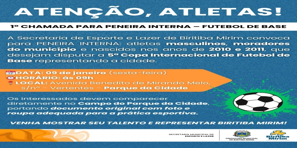 1ª CHAMADA PARA PENEIRA INTERNA DE FUTEBOL DE BASE