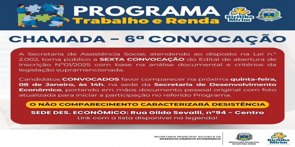 6ª CONVOCAÇÃO – PROGRAMA TRABALHO E RENDA