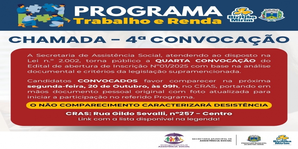 4ª CONVOCAÇÃO – PROGRAMA TRABALHO E RENDA