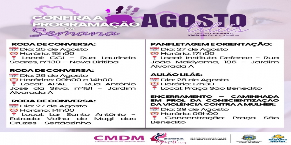 AGOSTO LILÁS BIRITIBA MIRIM – PROGRAMAÇÃO DA SEMANA | 25/08 À 29/08