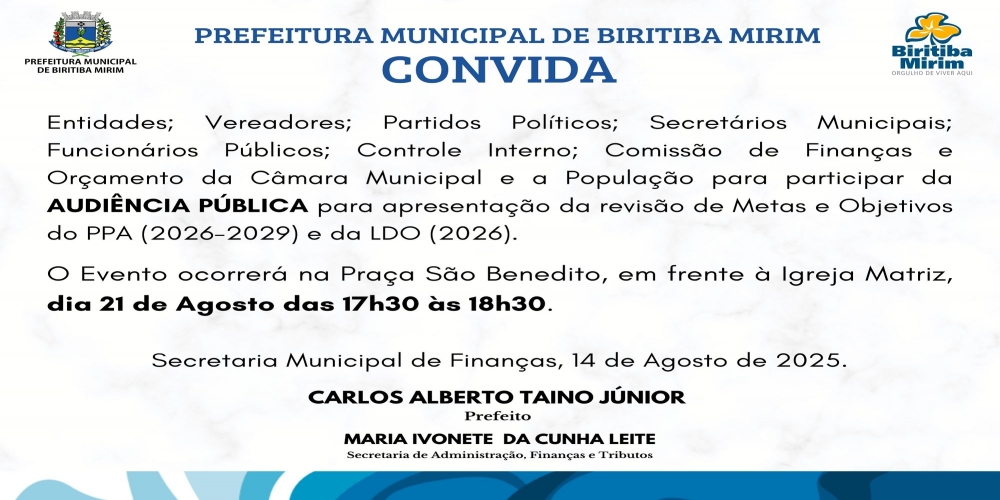 PREFEITURA MUNICIPAL DE BIRITIBA MIRIM CONVIDA: AUDIÊNCIA PÚBLICA PPA (2026-2029) E LDO (2026)