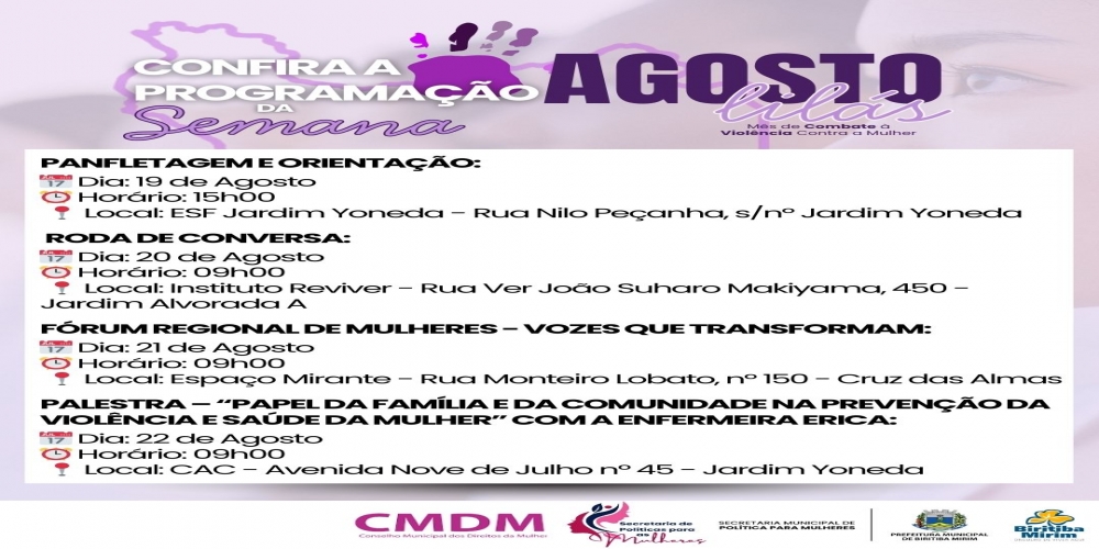 PROGRAMAÇÃO DA SEMANA – AGOSTO LILÁS 2025 | 19/08 À 22/08