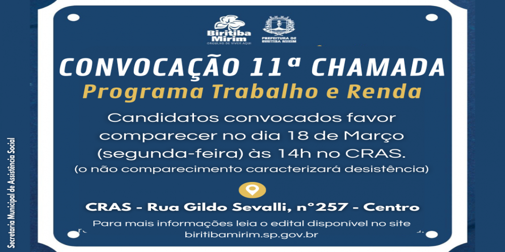 A Secretaria de Assistência Social solicita que os convocados estejam presentes na próxima SEGUNDA-FEIRA, dia 18 de Março, às 14h no CRAS.