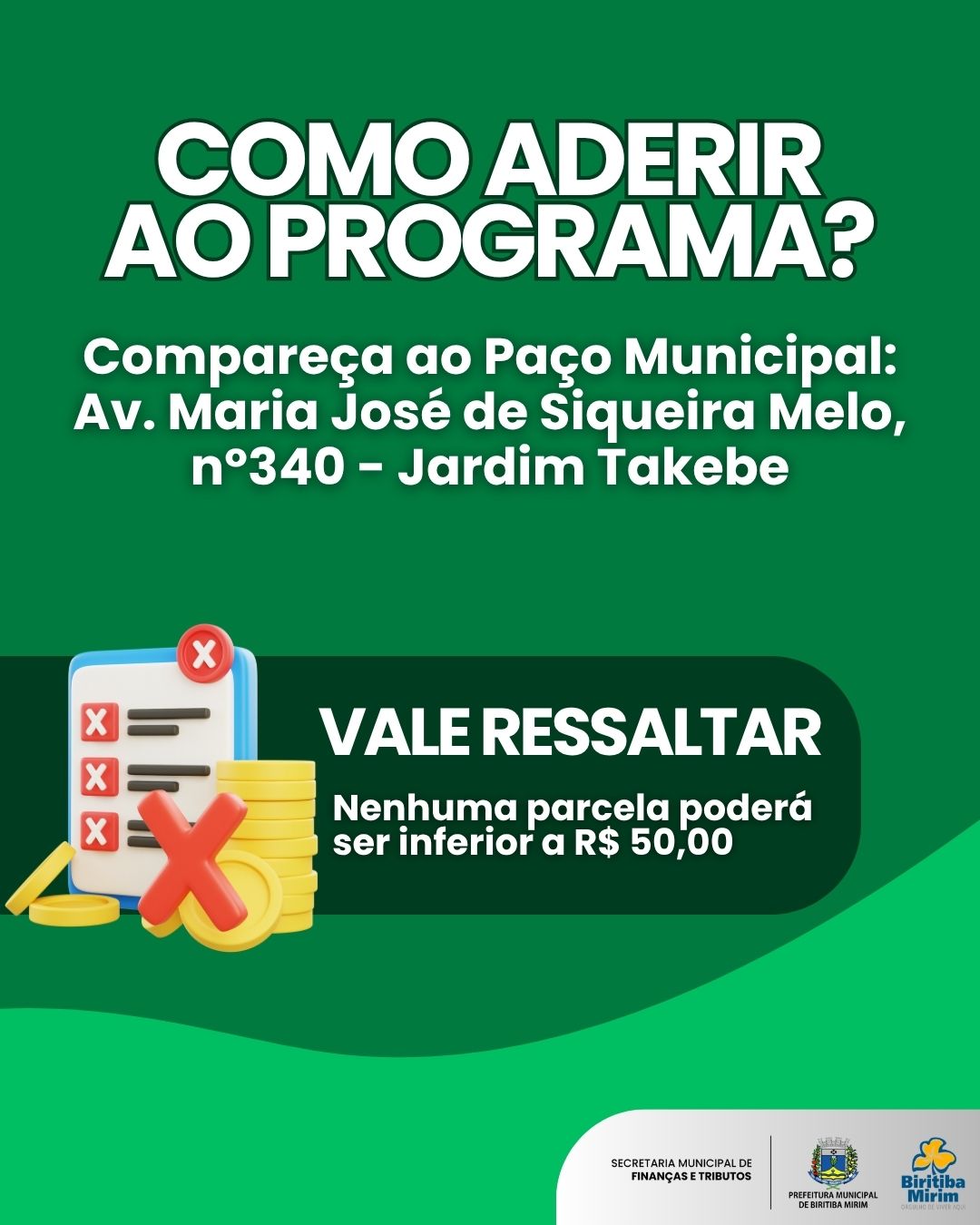 Para aderir ao programa é necessário comparecer ao Paço Municipal, localizado na Avenida Maria José de Siqueira Melo, nº340 no Jardim Takebe.