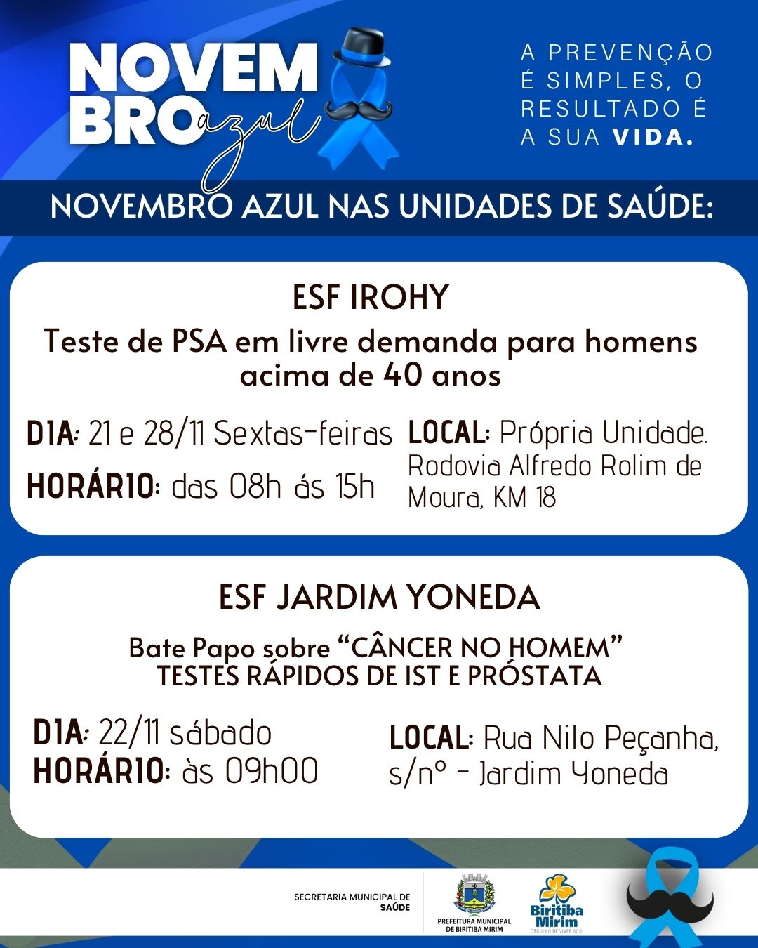 ESF YONEDA Dia 22/11 das 09h às 12h, haverá palestra com o tema Câncer do Homem, além de testes rápidos de HIV, sífilis e PSA. | Própria Unidade: Rua Nilo Peçanha, s/nº Jardim Yoneda.