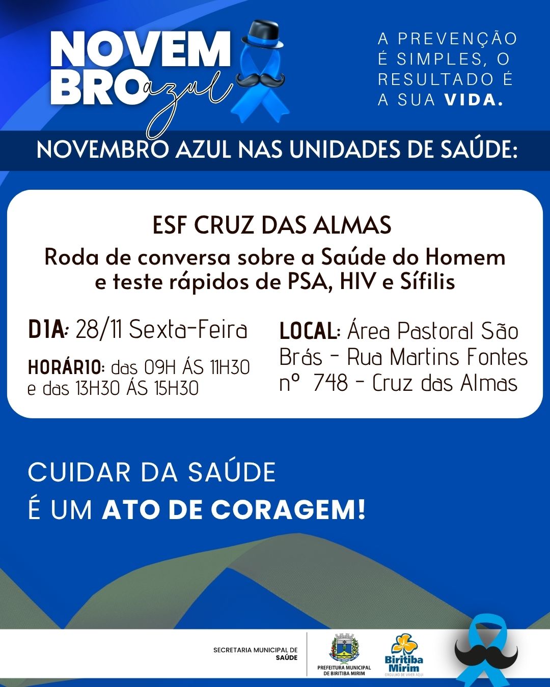 ESF CRUZ DAS ALMAS Dia 28/11, das 9h às 11h30 e das 13h30 às 15h30, acontecerá uma roda de conversa e testes rápidos de PSA, HIV e sífilis. | Área Pastoral São Brás Rua Martins Fontes n°748 Cruz das Almas.