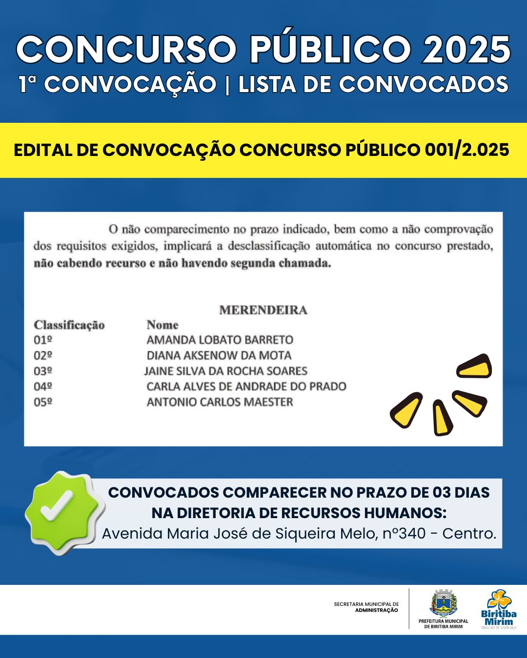 1ª CONVOCAÇÃO | EDITAL DE CONVOCAÇÃO CONCURSO PÚBLICO 001/2.025